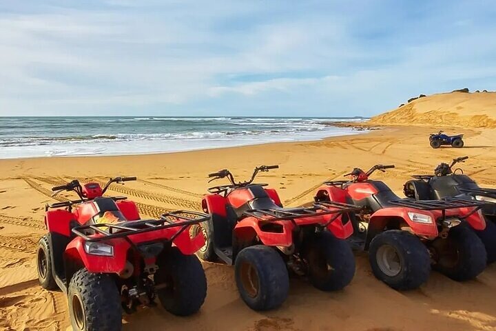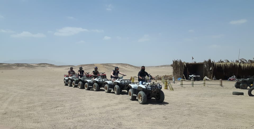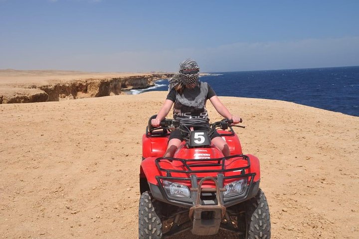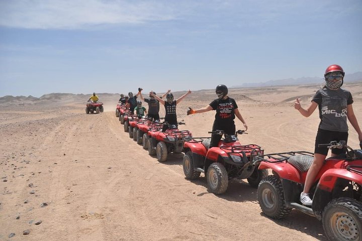 Discover the natural beauty of Makadi Bay on this ATV tour from Hurghada. Feel the wind whip through your hair as you maneuver through sand banks. Try riding through the dessert on the back of a camel. Enjoy the convenience of being picked up at your accommodation in Hurghada. Take in views of the countryside on the drive to the start of your tour. Get fitted with your helmet and hop on your ATV. Make your way over sandbanks and along the mountains until you reach the coast. Leave the bike behind and follow your guide to see a unique rock formation. Continue with the ATV to a natural beach where you can take a refreshing dip in the sea or explore the shoreline on foot. Head to a Bedouin area to have a delicious cup of Bedouin tea. After your tea, have the chance to ride a camel in the desert. Return to your accommodation in Hurghada at the end of your tour.